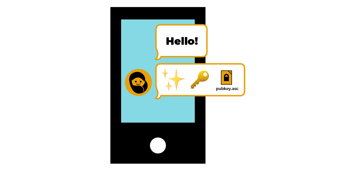 စမတ်ဖုန်းပေါ်မှာ သင့်သူငယ်ချင်း အက်စ်ရာဆီက လို့ပြောတဲ့ မက်ဆေ့ချ်ကို တွေ့နိုင်ပါတယ်။ သူမက “ဟဲလို” လို့မက်ဆေ့ချ်ပို့ပြီးတာနဲ့ အများသုံးဝှက်စာသော့ (pubkey.asc) နဲ့ အီမိုဂျီတွေပါတဲ့ မက်ဆေ့ ထပ်ပို့ပါတယ်။ |